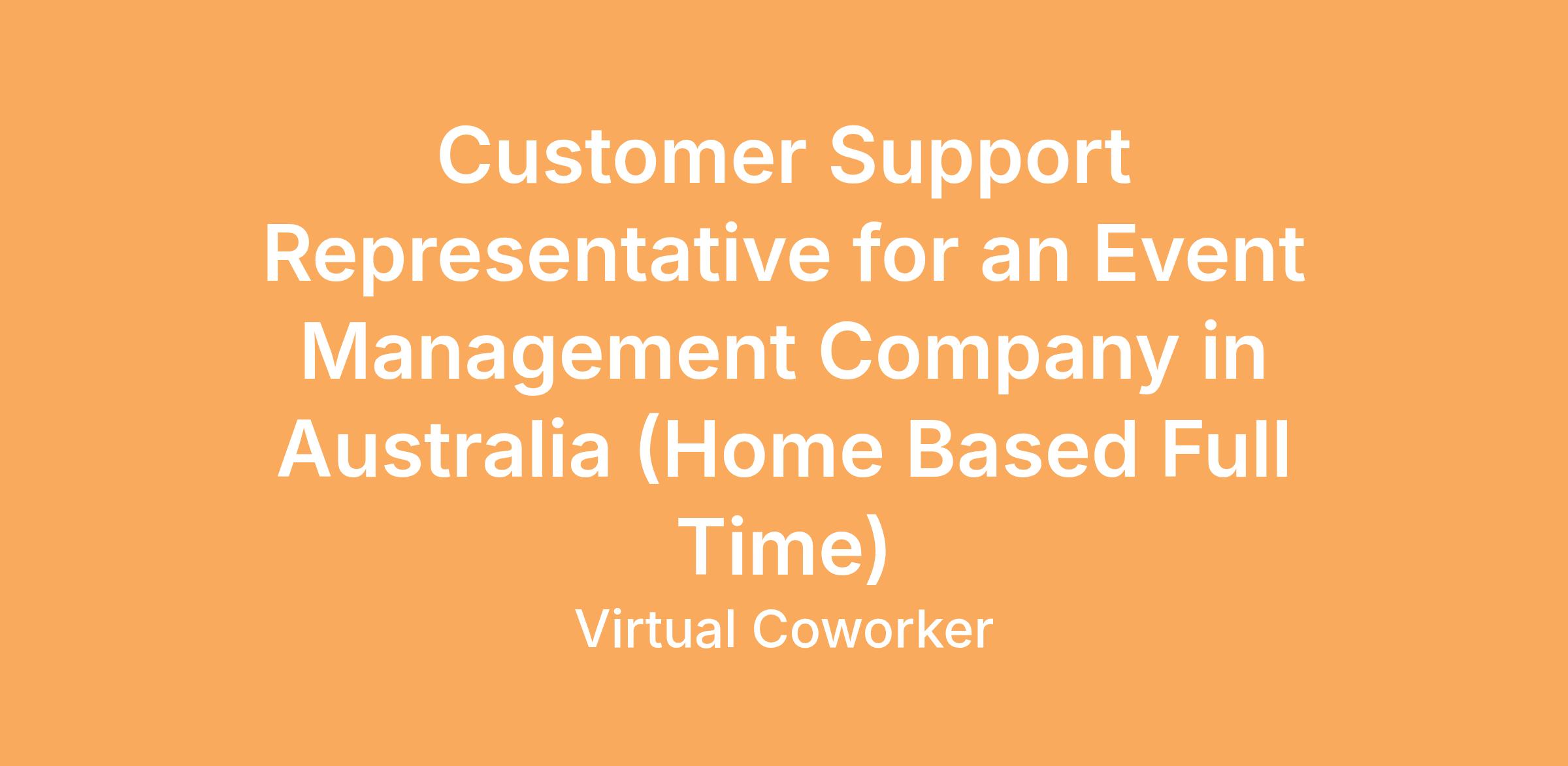 https:\/\/www.linkedin.com\/company\/virtual\-coworker"}],"isMobile":false,"iframe":"true","jobType":"Full time","applyName":"Apply Now!","zsoid":"8208015","FontFamily":"Arial, Helvetica, sans\-serif","jobOtherDetails":[{"fieldLabel":"Job Category","uitype":2,"value":"Customer Service\/Technical Support"},{"fieldLabel":"Work Schedule","uitype":1,"value":"Saturday \- 8:00 pm \- 4:00 am, Sunday & Monday \- 10:00am \- 7:00pm, Thurs & Friday \- 2:00 am \- 10:00am Eastern Daylight Time"},{"fieldLabel":"Hours Per Day","uitype":2,"value":"Full Time â 8 hours per day"},{"fieldLabel":"Industry","uitype":2,"value":"Technology"},{"fieldLabel":"Client Location","uitype":2,"value":"Flexible"},{"fieldLabel":"Work Location","uitype":1,"value":"Home Based \- Philippines"},{"fieldLabel":"City","uitype":1,"value":"TBC"},{"fieldLabel":"State\/Province","uitype":1,"value":"TBC"},{"fieldLabel":"Zip\/Postal Code","uitype":1,"value":"TBC"}],"headerName":"Customer Support Representative for an Event Management Company in Australia (Home Based Full Time)","widgetId":"147741000000390320","isJobBoard":"false","userId":"147741000000027001","attachArr":[],"customTemplate":"3","isCandidateLoginEnabled":true,"jobId":"147741000074299922","FontSize":"12","location":"TBC","embedsource":"CareerSite","logoId":"idwop0ece2fcac21a443ba16938fb832bdc3b"}