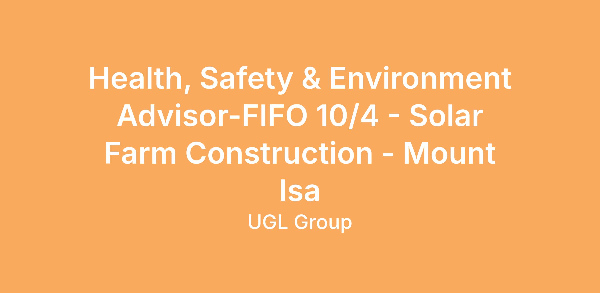 Health, Safety & Environment Advisor-FIFO 10/4 - Solar Farm Construction - Mount Isa