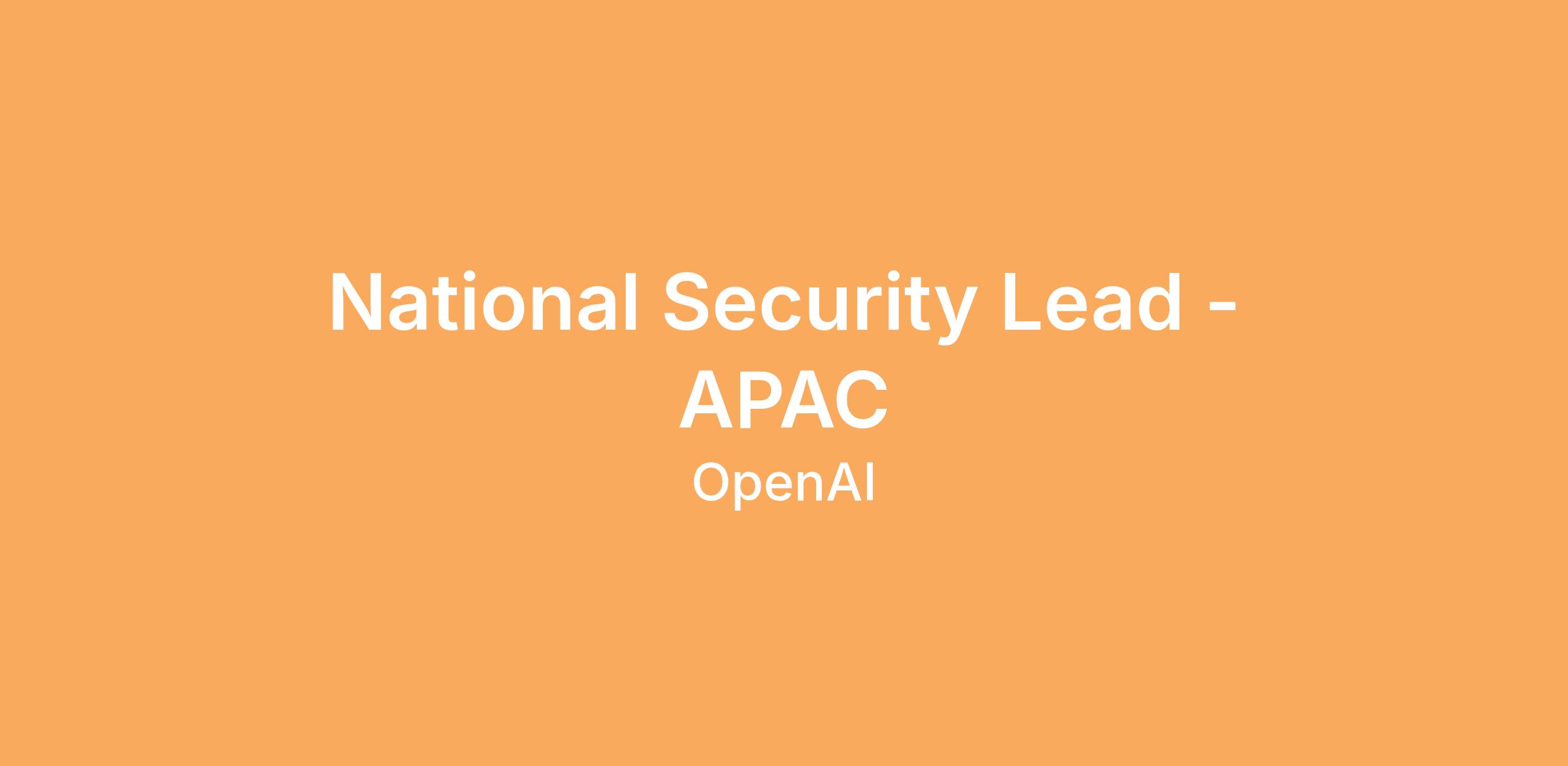 This position reports to OpenAI’s global Head of National Security Policy and will help advance OpenAI’s engagement with the Asia-Pacific national security community. This is a senior IC role leading OpenAI’s Asia-Pacific security and technology policy engagement in support of our regional strategy. You will be OpenAI’s primary policy representative on matters related to defense, security, and AI policy across the region, positioning OpenAI as a trusted partner for national security stakeholders across allied and partner governments, regional multilateral fora, and key security institutions.